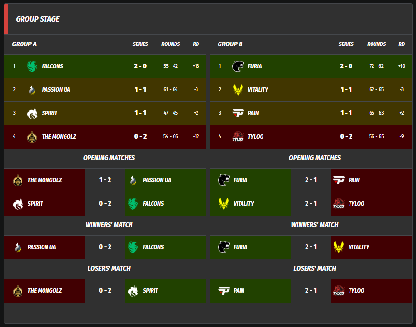 Phase de groupes : FURIA a dominé le groupe B, prenant la première place avec un score net de 2-0, surpassant des adversaires redoutables comme Vitality et paiN Gaming.