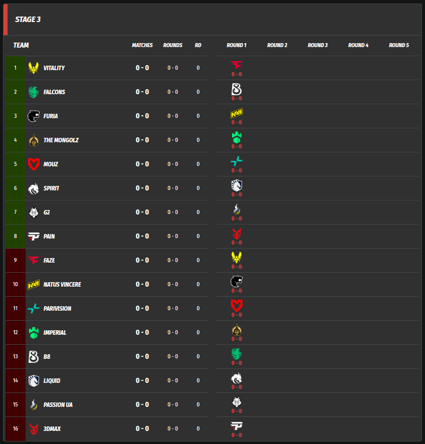 Le tableau du tournoi de la troisième étape a été divisé en deux parties. Les huit premières équipes — FURIA Esports, Vitality, Falcons, The MongolZ, MOUZ, Spirit, G2 et paiN Gaming — ont été directement invitées par les organisateurs, évitant les deux premières étapes. Les huit autres places ont été disputées dans une compétition acharnée : Natus Vincere, FaZe, B8, Imperial, PARIVISION, Liquid, Passion UA et 3DMAX ont atteint le top 16 à l'issue de la deuxième étape.
